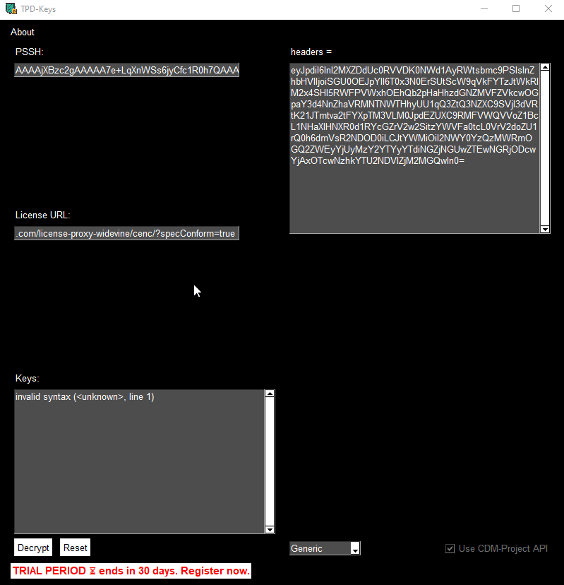I tried various tutorial CDM project to DRMtoday, i got the PSSH and the header but the TPD-keys returns "invalid syntax" am i missing something?