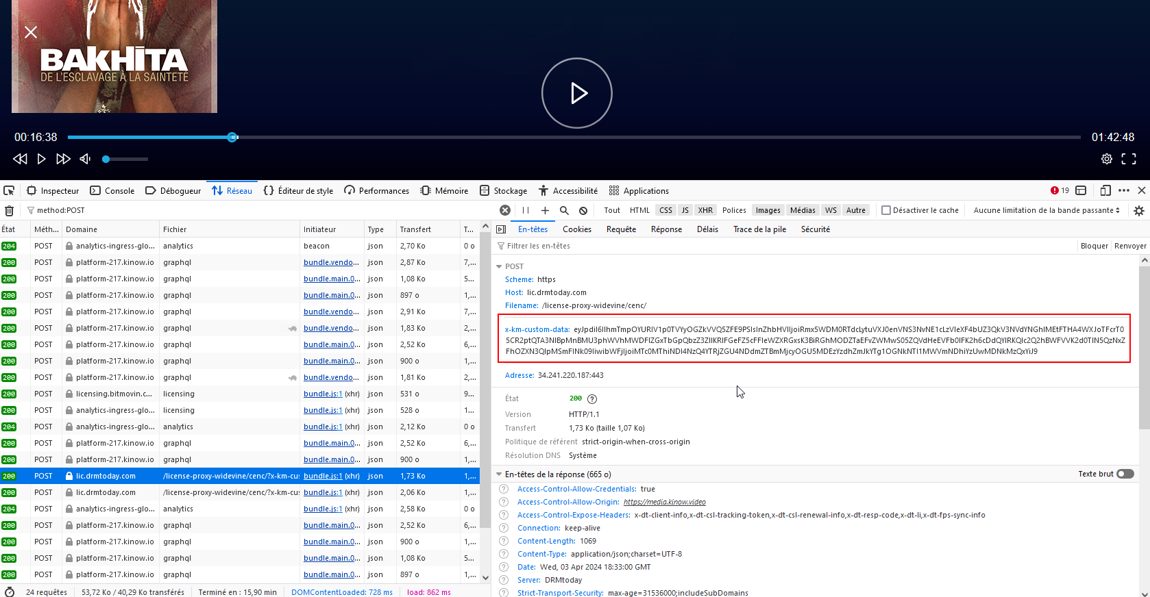 Bon je passe en français, y'a t il des contenus gratuits sur ce site ? Sinon ca va être compliqué pour moi de t'aider.. La valeur de x-km-custom-data change à chaque requête (ou quand toi tu refresh) donc je ne peux pas obtenir la clé (je n'ai pas de .mpd non plus du coup..)