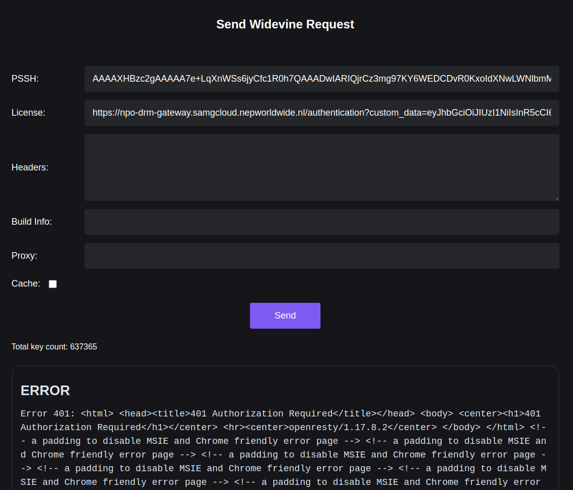 So far so good, but not actually the challenge I'm facing. https://cdrm-project.com/ doesn't work for me, maybe it geo-blocks getting the keys or the keys are not known. So I started my own journey after HOURS of reading.Code:https://npo-drm-gateway.samgcloud.nepworldwide.nl/authentication?custom_data=eyJhbGciOiJIUzI1NiIsInR5cCI6IkpXVCJ9.eyJpc3MiOiJucG8iLCJpYXQiOjE3MTI0MzY4NjMsImxpY2Vuc2VfcHJvZmlsZSI6IndlYiIsImRybV90eXBlIjoid2lkZXZpbmUiLCJjbGllbnRfaXAiOiI4Mi4xNjMuNDcuMjA0In0.3GFBAX4y_1Jlds5WiTVUgkla7tIiNMbXtGGvQVyYYmE