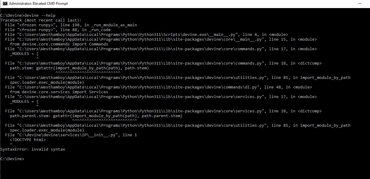 I could do with some help please chaps..... Things seem to have taken a radical turn for the worse... if i try to run devine --help from an elevated cmd prompt from my devine folder I no longer get: