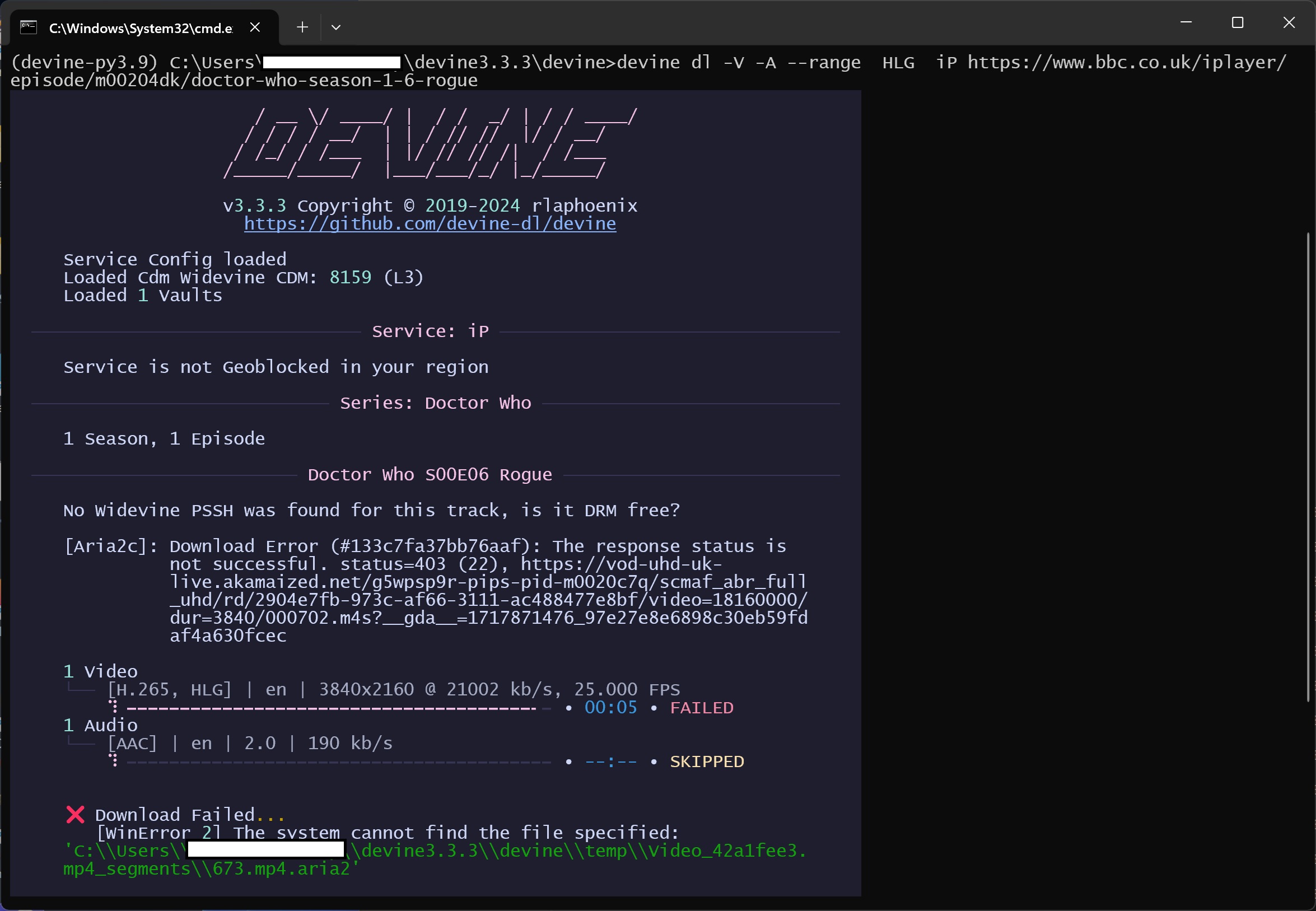 / __ \/ ____/ | / / _/ | / / ____/ / / / / __/ | | / // // |/ / __/ / /_/ / /___ | |/ // // /| / /___ /_____/_____/ |___/___/_/ |_/_____/ ⠀ v3.3.3 Copyright © 2019-2024 rlaphoenix https://github.com/devine-dl/devine Service Config loaded Loaded Cdm Widevine CDM: 8159 (L3) Loaded 1 Vaults ─────────────────────────────── Service: iP ──────────────────────────────── Service is not Geoblocked in your region ──────────────────────────── Series: Doctor Who ──────────────────────────── 2 Seasons, 10 Episodes ───────────────────────── Doctor Who S01E06 Rogue ────────────────────────── No Widevine PSSH was found for this track, is it DRM free? [Aria2c]: Download Error (#e8b2a257072774d3): The response status is not successful. status=403 (22), https://vod-uhd-uk- live.akamaized.net/g5wpsp9r-pips-pid-m0020c7q/scmaf_abr_full _uhd/rd/2904e7fb-973c-af66-3111-ac488477e8bf/video=18160000/ dur=3840/000702.m4s?__gda__=1717885625_d2dae3d0a1729ee573d76 f0131dadcd8 1 Video └── [H.265, HLG] | en | 3840x2160 @ 21002 kb/s, 25.000 FPS ⠼ ━━━━━━━━━━━━━━━━━━━━━━━━━━━━━━━━━━━━━━━╺ • 00:04 • FAILED 1 Audio └── [AAC] | en | 2.0 | 190 kb/s ⠼ ━━━━━━━━━━━━━━━━━━━━━━━━━━━━━━━━━━━━━━━━ • --:-- • SKIPPED 2 Subtitles ├── [TTML] | en │ ⠼ ━━━━━━━━━━━━━━━━━━━━━━━━━━━━━━━━━━━━━━━━ • --:-- • SKIPPED └── [TTML] | en | SDH ⠼ ━━━━━━━━━━━━━━━━━━━━━━━━━━━━━━━━━━━━━━━━ • --:-- • SKIPPED ❌ Download Failed... [WinError 2] The system cannot find the file specified: 'C:\\Users\\XXXXX\\devine3.3.3\\devine\\temp\\Video_42a1fee3. mp4_segments\\687.mp4.aria2' -