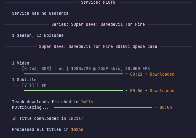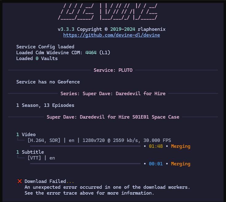 The geo was US and the cmd was devine dl PLUTO https://pluto.tv/us/on-demand/series/56251a895bbc83b93e39d225/season/1 as stabbedbybrick stated the problem seems to be on my end. The debug logs don't seem to indicate what the issue could be.