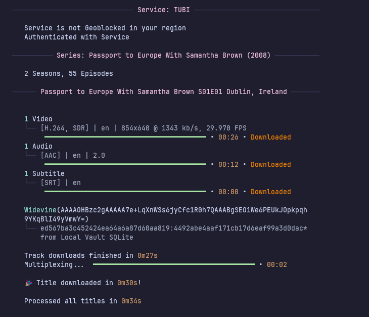 Code:devine.exe -d dl -w S01E01 TUBI "https://tubitv.com/series/300001797/passport-to-europe-with-samantha-brown"