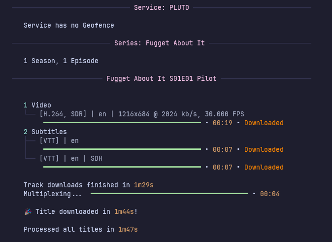 5. Hi all, I installed devine, downloaded the dependencies and added it to my devine install directory, setup my devine.yaml, services, and wvd. I checked 'devine cfg --list' and it showed that it recognized everything. So then I went ahead and tried a simple download from PlutoTV:
