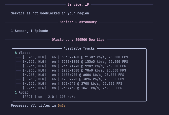 Code:devine dl --list-titles iP https://www.bbc.co.uk/iplayer/episode/p0j4x4tr/glastonbury-coldplay ─────────────────────────────── Service: iP ──────────────────────────────── Service is not Geoblocked in your region ─────────────────────────── Series: Glastonbury ──────────────────────────── 1 Season, 1 Episode └── Season 0: 1 episodes └── 0. Coldplay