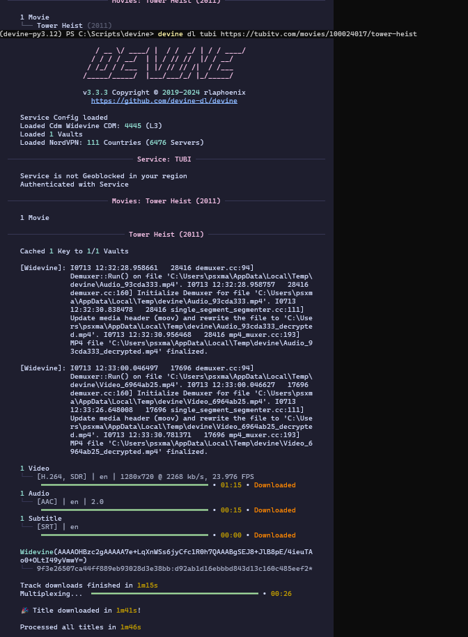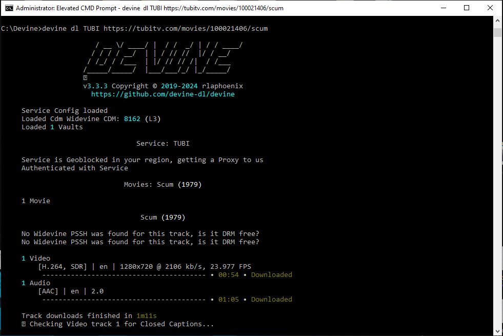i.e. C:\Devine>devine dl tubi https://tubitv.com/tv-shows/200005152/s01-e06-the-sixties-weekender