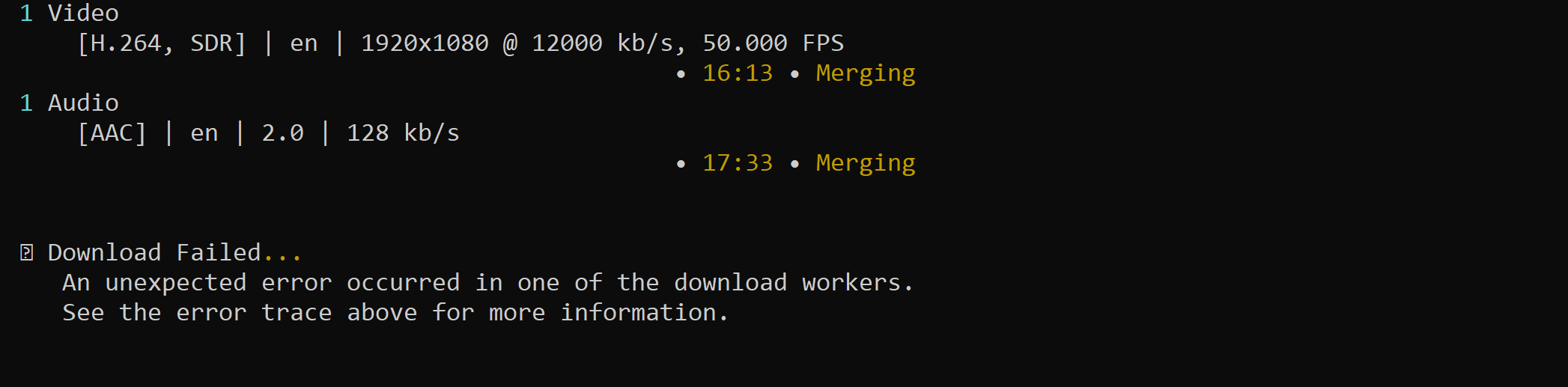 Code:Service Config loaded Loaded Cdm Widevine CDM: 22589 (L3) Loaded 0 Vaults ────────────────────────────── Service: PLUTO ────────────────────────────── Service has no Geofence ───────────────────────────── Series: Webster ────────────────────────────── 1 Season, 4 Episodes ─────────────────── Webster S06E01 The Wild, Wild Webst ──────────────────── 1 Video └── [H.264, SDR] | en | 1280x720 @ 2442 kb/s, 30.000 FPS ━━━━━━━━━━━━━━━━━━━━━━━━━━━━━━━━━━━━━━━━ 00:21 Downloaded 1 Subtitle └── [VTT] | en ━━━━━━━━━━━━━━━━━━━━━━━━━━━━━━━━━━━━━━━━ 00:55 Downloaded Track downloads finished in 1m1s Multiplexing... ⠋ ━━━━━━━━━━━━━━━━━━━━━━━━━━━━━━━━━━━━━━━━ ╭───────────────────── Traceback (most recent call last) ──────────────────────╮ │ in _run_module_as_main:198 │ │ in _run_code:88 │ │ │ │ in <module>:7 │ │ │ │ C:\Users\Brian\AppData\Local\Programs\Python\Python312\Lib\site-packages\cli │ │ ck\core.py:1157 in __call__ │ │ │ │ C:\Users\Brian\AppData\Local\Programs\Python\Python312\Lib\site-packages\cli │ │ ck\core.py:1078 in main │ │ │ │ C:\Users\Brian\AppData\Local\Programs\Python\Python312\Lib\site-packages\cli │ │ ck\core.py:1688 in invoke │ │ │ │ C:\Users\Brian\AppData\Local\Programs\Python\Python312\Lib\site-packages\cli │ │ ck\core.py:1688 in invoke │ │ │ │ C:\Users\Brian\AppData\Local\Programs\Python\Python312\Lib\site-packages\cli │ │ ck\core.py:1657 in _process_result │ │ │ │ C:\Users\Brian\AppData\Local\Programs\Python\Python312\Lib\site-packages\cli │ │ ck\core.py:783 in invoke │ │ │ │ C:\Users\Brian\AppData\Local\Programs\Python\Python312\Lib\site-packages\dev │ │ ine\commands\dl.py:697 in result │ │ │ │ 694 │ │ │ │ │ ): │ │ 695 │ │ │ │ │ │ for task_id, task_tracks in multiplex_tasks: │ │ 696 │ │ │ │ │ │ │ progress.start_task(task_id) # TODO: Need │ │ ❱ 697 │ │ │ │ │ │ │ muxed_path, return_code = task_tracks.mux( │ │ 698 │ │ │ │ │ │ │ │ str(title), │ │ 699 │ │ │ │ │ │ │ │ progress=partial(progress.update, task │ │ 700 │ │ │ │ │ │ │ │ delete=False │ │ │ │ C:\Users\Brian\AppData\Local\Programs\Python\Python312\Lib\site-packages\dev │ │ ine\core\tracks\tracks.py:413 in mux │ │ │ │ 410 │ │ │ │ 411 │ │ # let potential failures go to caller, caller should handle │ │ 412 │ │ try: │ │ ❱ 413 │ │ │ p = subprocess.Popen([ │ │ 414 │ │ │ │ *cl, │ │ 415 │ │ │ │ "--output", str(output_path), │ │ 416 │ │ │ │ "--gui-mode" │ │ │ │ C:\Users\Brian\AppData\Local\Programs\Python\Python312\Lib\subprocess.py:102 │ │ 6 in __init__ │ │ │ │ 1023 │ │ │ │ │ self.stderr = io.TextIOWrapper(self.stderr, │ │ 1024 │ │ │ │ │ │ │ encoding=encoding, errors=errors) │ │ 1025 │ │ │ │ │ ❱ 1026 │ │ │ self._execute_child(args, executable, preexec_fn, close_f │ │ 1027 │ │ │ │ │ │ │ │ pass_fds, cwd, env, │ │ 1028 │ │ │ │ │ │ │ │ startupinfo, creationflags, shell, │ │ 1029 │ │ │ │ │ │ │ │ p2cread, p2cwrite, │ │ │ │ C:\Users\Brian\AppData\Local\Programs\Python\Python312\Lib\subprocess.py:153 │ │ 8 in _execute_child │ │ │ │ 1535 │ │ │ │ │ 1536 │ │ │ # Start the process │ │ 1537 │ │ │ try: │ │ ❱ 1538 │ │ │ │ hp, ht, pid, tid = _winapi.CreateProcess(executable, │ │ 1539 │ │ │ │ │ │ │ │ │ │ # no special security │ │ 1540 │ │ │ │ │ │ │ │ │ │ None, None, │ │ 1541 │ │ │ │ │ │ │ │ │ │ int(not close_fds), │ ╰──────────────────────────────────────────────────────────────────────────────╯ FileNotFoundError: [WinError 2] The system cannot find the file specified -