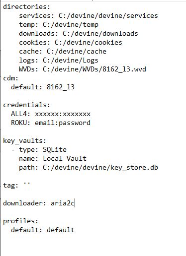 I put my .wvd in the default directory.Code:directories: services: "d:/desktop/devine/services" cdm: default: l3 downloader: aria2c dl: sub_format: srt -
