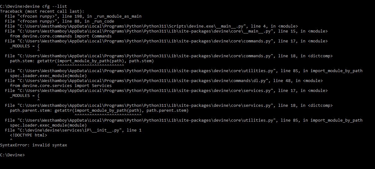 I get this identical error message if i use "devine cfg --list" or "devine --help"