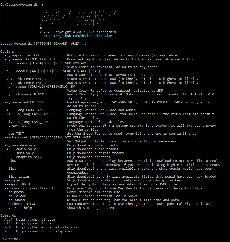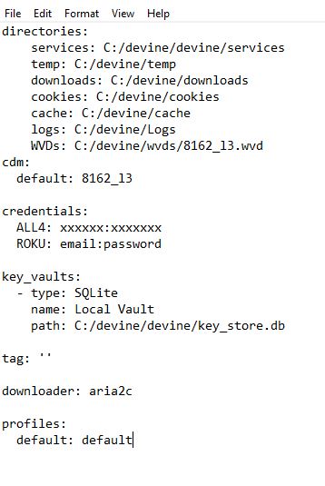 that's exactly how it should look. With quotation marks. And listing the directory only. No filenames. With a lowercase "wvd".Code:The following directories are available and may be overridden, commands - CLI Command Classes. services - Service Classes. vaults - Vault Classes. fonts - Font files (ttf or otf). downloads - Downloads. temp - Temporary files or conversions during download. cache - Expiring data like Authorization tokens, or other misc data. cookies - Expiring Cookie data. logs - Logs. wvds - Widevine Devices. For example, downloads: "D:/Downloads/devine" temp: "D:/Temp/devine"Last edited by achilles; 10th Apr 2024 at 13:28.