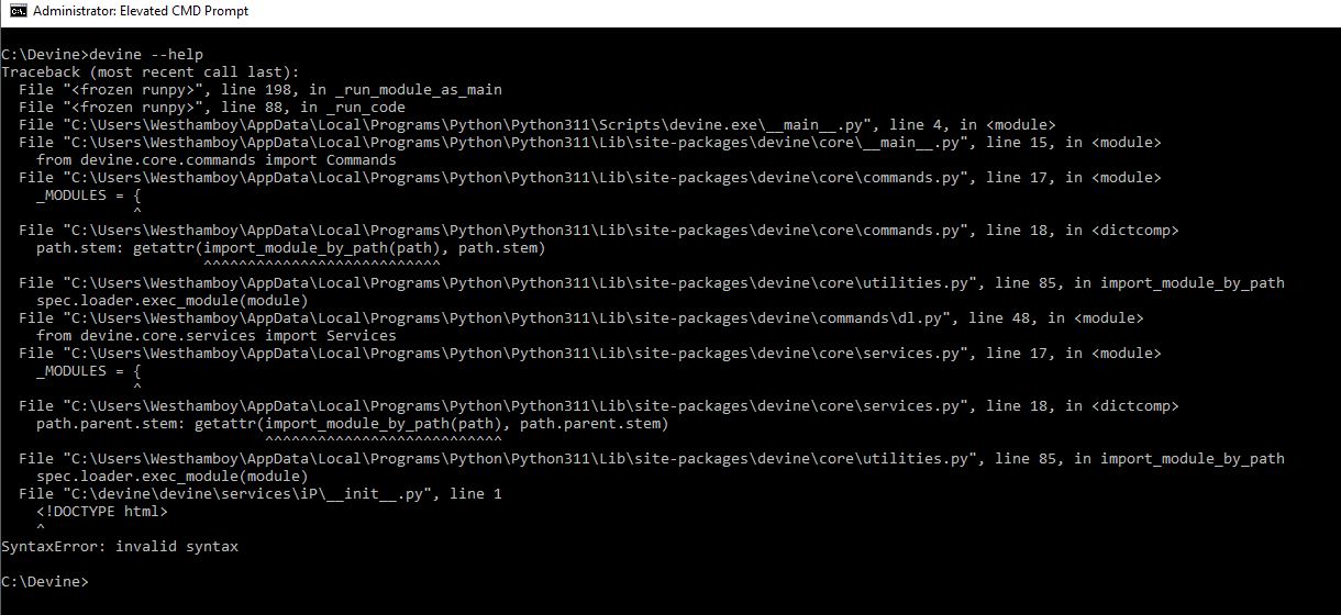 so the devine.yaml within C:\Users\xxxxxx\AppData\Local\devine caused the error message.