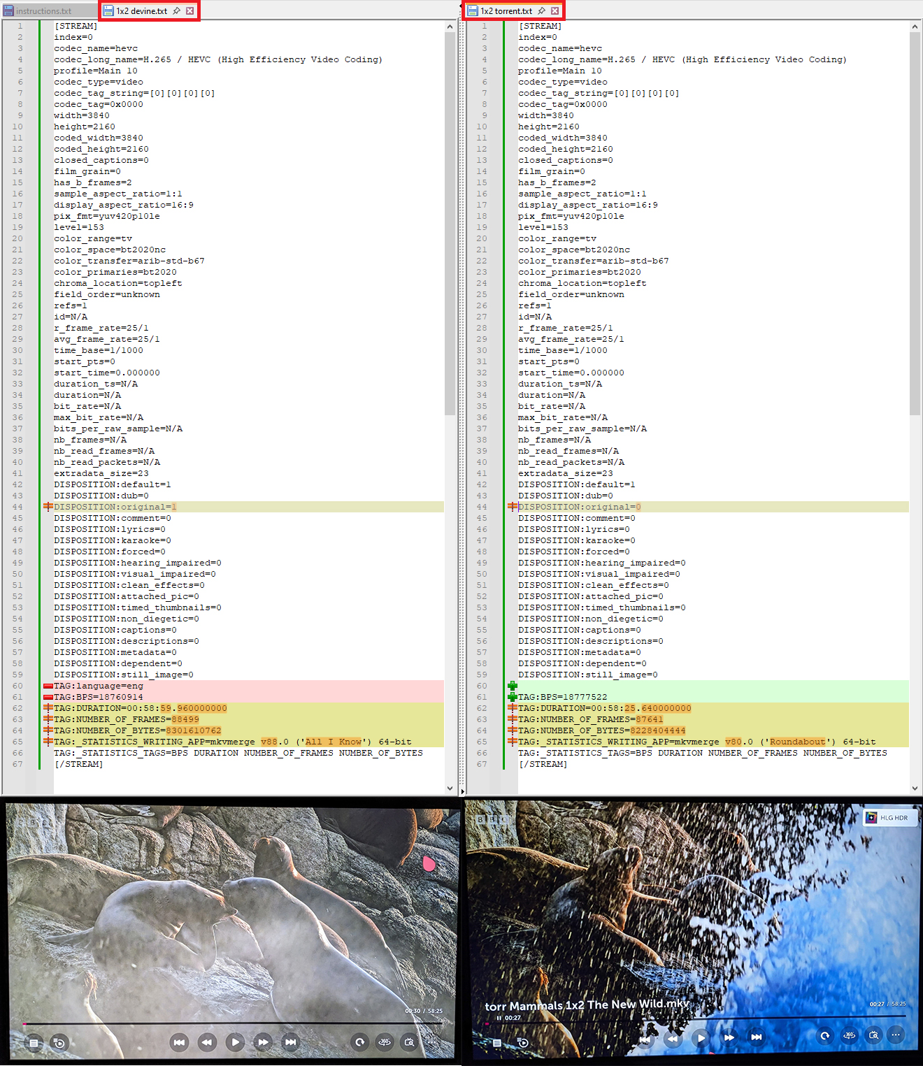 The file on the left is also UHD with HDR that is HLG.