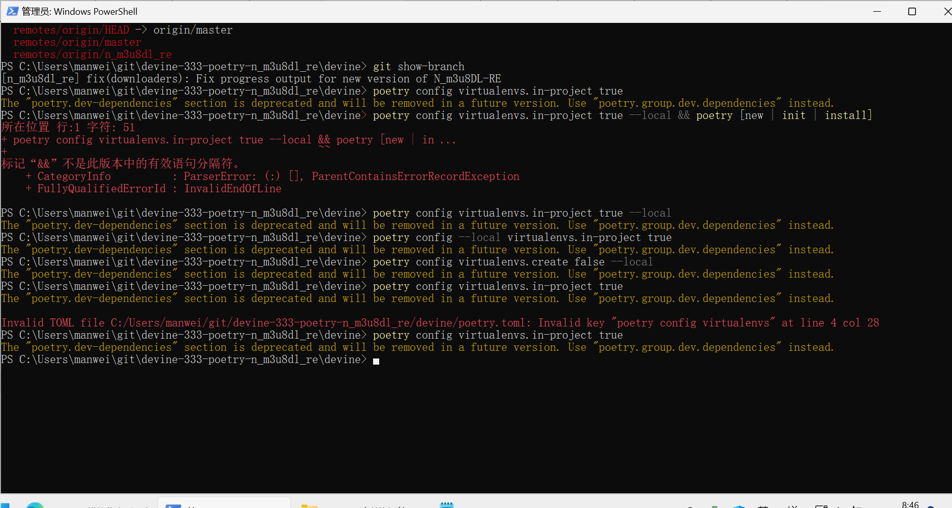 you get an error and again you fire upCode:poetry config virtualenvs.in-project true --local && poetry [new | init | install]