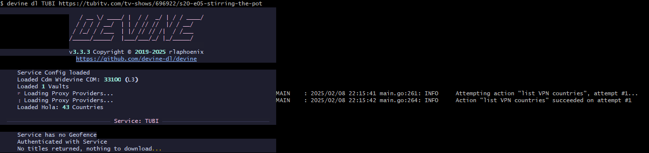 TUBI has been updated. Authorization with cookies no-longer required and slightly better bitrate than before (still 720p, though). Geofence has been removed, so as long as you connect from the region where the title is available it should work. If not, the error will tell you what region(s) the title is available in. And due to requests downloader not giving any output, and n_m3u8dl_re can't handle the DASH for some reason, Aria2c has been set as downloader in the service itself.