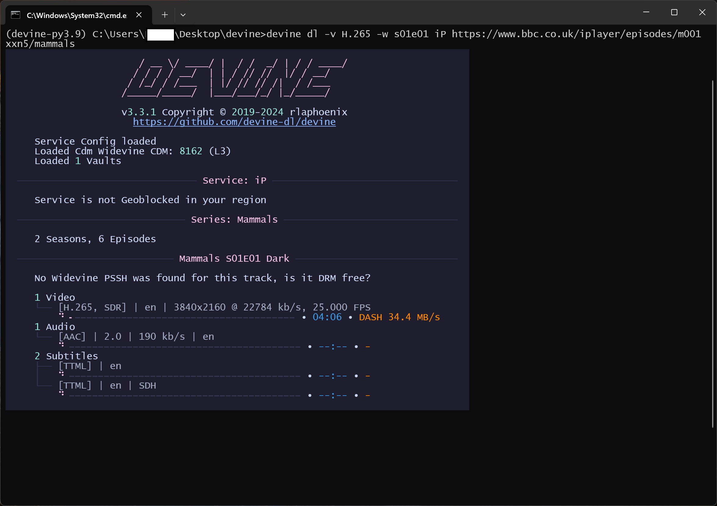 Code:#S01E04 https://www.bbc.co.uk/iplayer/episode/m001ykh8/mammals-series-1-4-cold py -3.10 -m poetry run devine dl --list-titles iP m001xxn5 py -3.10 -m poetry run devine dl --list -w S01E04 iP m001xxn5 py -3.10 -m poetry run devine dl --list -v H.265 -w S01E04 iP m001xxn5 #To make sure it does not MUX to MKV (SUB=TTML) py -3.10 -m poetry run devine dl -v H.265 -w S01E04 --no-folder --sub-format TTML iP m001xxn5