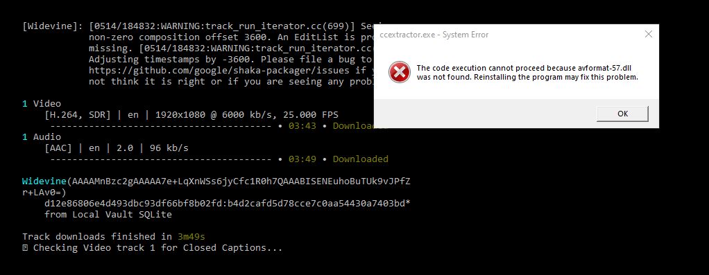 I had downloaded ccextractor.win.full.rar and did a full install weeks ago,... and assumed I had done the right thing. It wasn't until today that ccextractor had come into use and thus I came upon the error. I did check the files in the temp folder, and the video and audio had both been de-scrambled, so It was almost there. I've no idea why I had that strange shaka-packager error, something about a non-zero composition offset 3600. an editlist is probably missing. It just made me think that it was my internet at fault, and that it wasn't requesting the right information. I'll get there in the end, Thank you for the file list, I'll get them into my devine folder and do another test. -