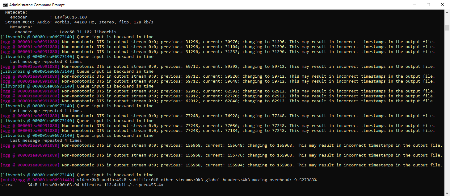 ffmpeg then produces numerous caution messages like -Code:ffmpeg -i input [ogg file with no extension] -codec:a libvorbis -b:a 128k [ogg file with no extension]_128k.ogg