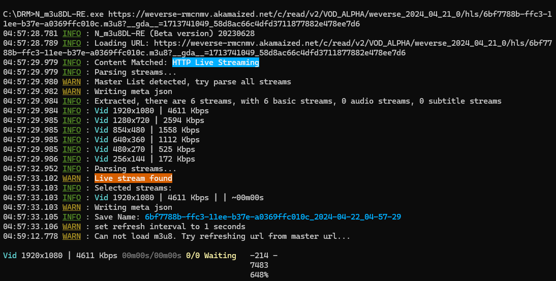 Code:yt-dlp https://weverse.io/enhypen/live/3-161167333 [Weverse] Extracting URL: https://weverse.io/enhypen/live/3-161167333 [Weverse] 3-161167333: Downloading API JSON [Weverse] 3-161167333: Downloading VOD API key [Weverse] 3-161167333: Downloading VOD JSON [Weverse] 3-161167333: Downloading m3u8 information [info] 3-161167333: Downloading 1 format(s): 1080P_1920_5120_192 [download] Resuming download at byte 26693151 [download] Destination: 일요일 [3-161167333].mp4 [download] 100% of 1.43GiB in 00:07:31 at 3.24MiB/s
