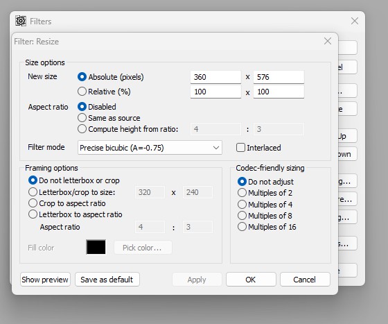 Add the Resize filter, set up the first resize (to 360) exactly as per this: