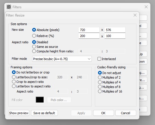 Now, add another instance of the Resize filter to go back to 720x576:
