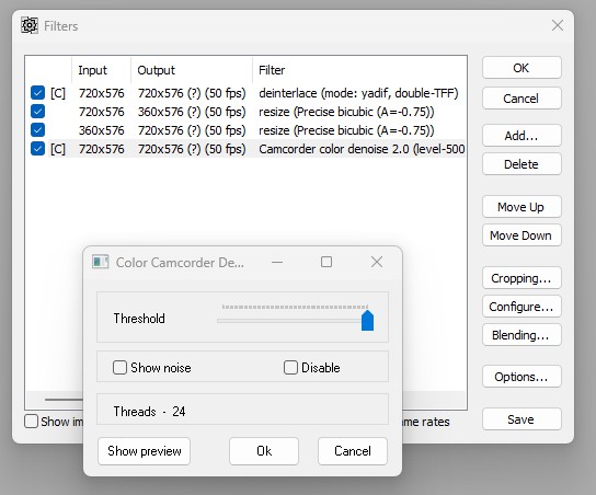 Code:AssumeTFF() QTGMC() #deinterlace spline36resize(360x576).spline36resize(720x576) #horizontal downscale-upscale trick for VHS to reduce dotcrawl
