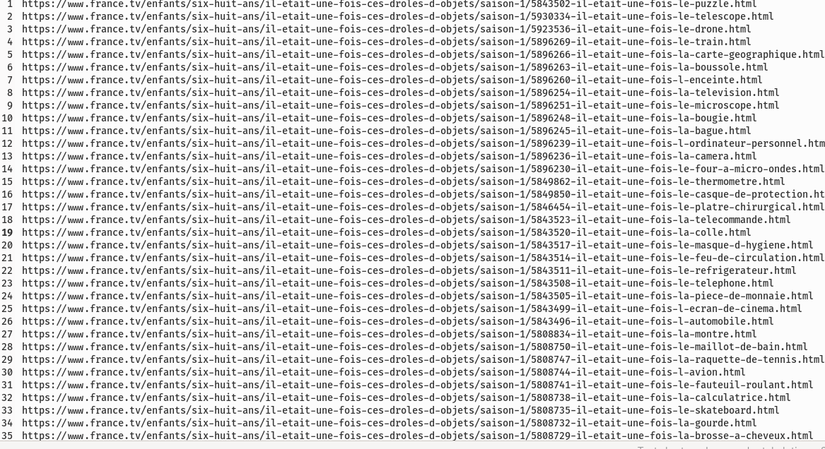 cmd:Code:import json import re import requests from bs4 import BeautifulSoup from unidecode import unidecode TA_URL = 'https://hdfauth.ftven.fr/esi/TA' VIDEOS_URL = 'https://k7.ftven.fr/videos/{video_id}' BASE_URL = 'https://www.france.tv' def get_all_json_contents(source_text): json_contents = [] for start_char, end_char in [("{", "}"), ("[", "]")]: start_str = f"window.FTVPlayerVideos = {start_char}" start_index = source_text.find(start_str) if start_index == -1: continue opening_brackets = 0 start_index += len(start_str) - 1 text_len = len(source_text) for char_index in range(start_index, text_len): if source_text[char_index] == start_char: opening_brackets += 1 elif source_text[char_index] == end_char: opening_brackets -= 1 if opening_brackets == 0: json_object = json.loads(source_text[start_index:char_index + 1]) if type(json_object) is not list: json_object = [json_object] json_contents += [json_object] break return json_contents def get_video_json_content(source_url): for json_content in get_all_json_contents(requests.get(source_url).content.decode()): for content in json_content: video_id = content.get("videoId", None) origin_url = content.get("originUrl", None) if video_id is None or origin_url is None: continue if source_url.endswith(origin_url): return content return None def get_videos_from_url(page_url): soup = BeautifulSoup(requests.get(page_url).content.decode(), 'html.parser') a_elements = soup.find_all('a', attrs={'data-video-id': True}) return [f'{BASE_URL}{a["href"]}' for a in a_elements] def get_all_videos_from_url(series_url): page = -1 source_urls = [] while True: page += 1 page_urls = get_videos_from_url(f'{series_url}?page={page}') if len(page_urls) == 0: break source_urls += page_urls return source_urls SERIES_URL = "https://www.france.tv/enfants/six-huit-ans/il-etait-une-fois-ces-droles-d-objets/toutes-les-videos/" for source_url in get_all_videos_from_url(SERIES_URL): print(source_url)