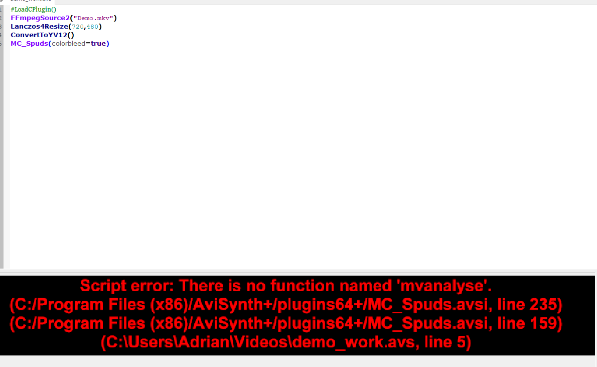 Im tryna get MC Spuds to work but this error keeps popping up but I got MV Tools which includes MVAnalyse,