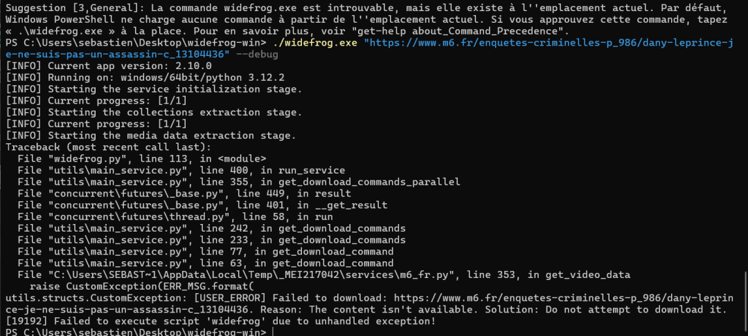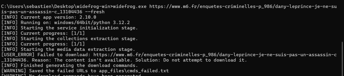 Is it important?Code:D:\widefrog_v2_10_0_p>python widefrog.py https://www.m6.fr/enquetes-criminelles-p_986/dany-leprince-je-ne-suis-pas-un-assassin-c_13104436 [WARNING] The service veeps.com cannot be used because it is not properly implemented, has package errors or has syntax errors. After fixing the issue delete the app_files folder. [INFO] Current app version: 2.10.0 [INFO] Running on: windows/64bit/python 3.12.2 [INFO] Starting the service initialization stage. [INFO] Current progress: [1/1] [INFO] Starting the collections extraction stage. [INFO] Current progress: [1/1] [INFO] Starting the media data extraction stage. [INFO] Current progress: [1/1] [INFO] Finished generating the download commands. [INFO] Saved the generated download commands to app_files\cmds.txt [INFO] If you used a VPN, turn it off to avoid wasting data for the downloading stage. Also you may edit the app_files\cmds.txt file if necessary. Type yes when ready: yes [INFO] Starting the downloading stage. [INFO] Current progress: [1/1] [INFO] SUCCESS! Finished downloading.