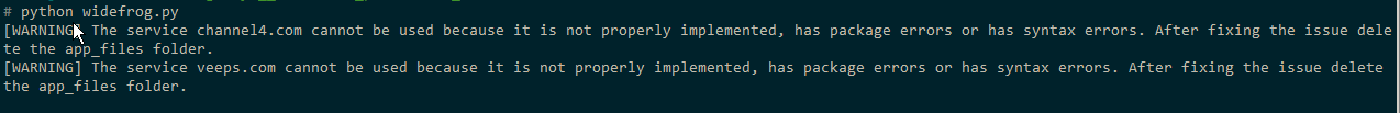 [WARNING] The service channel4.com cannot be used because it is not properly implemented, has package errors or has syntax errors. After fixing the issue delete the app_files folder.