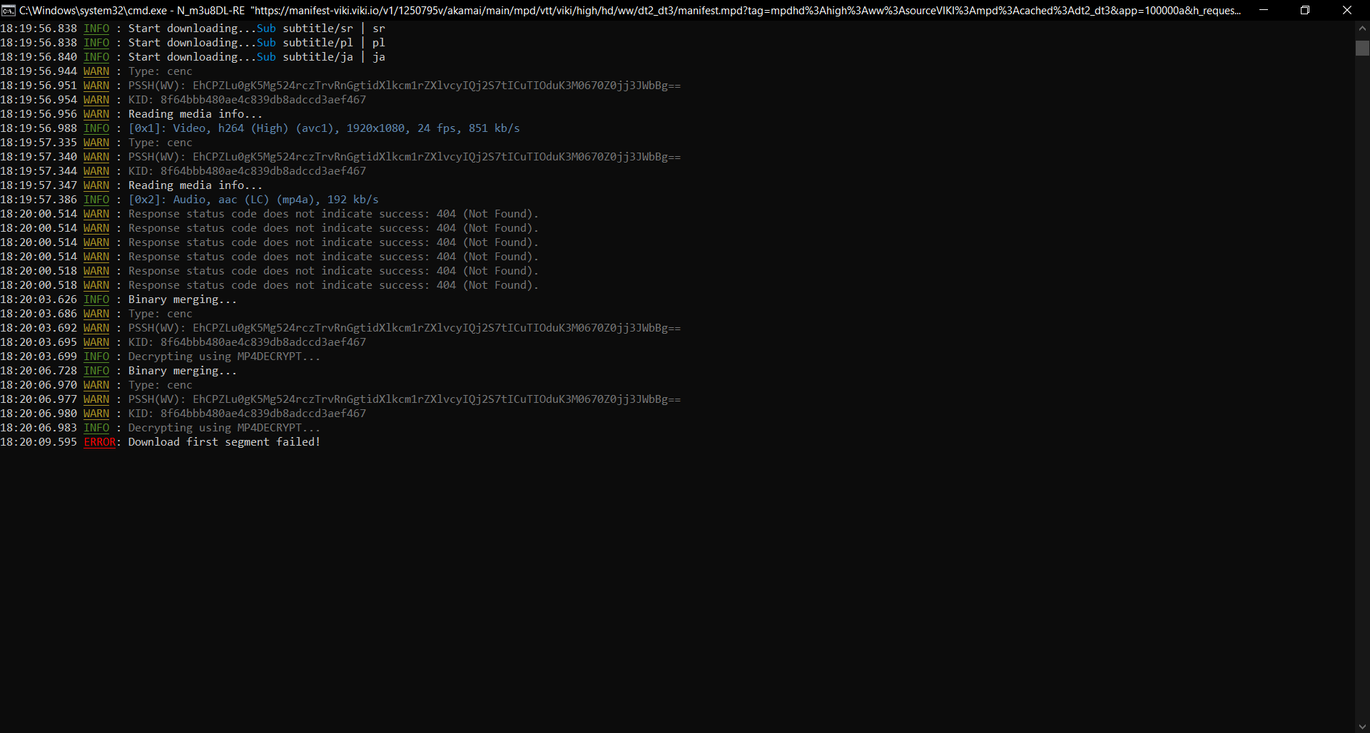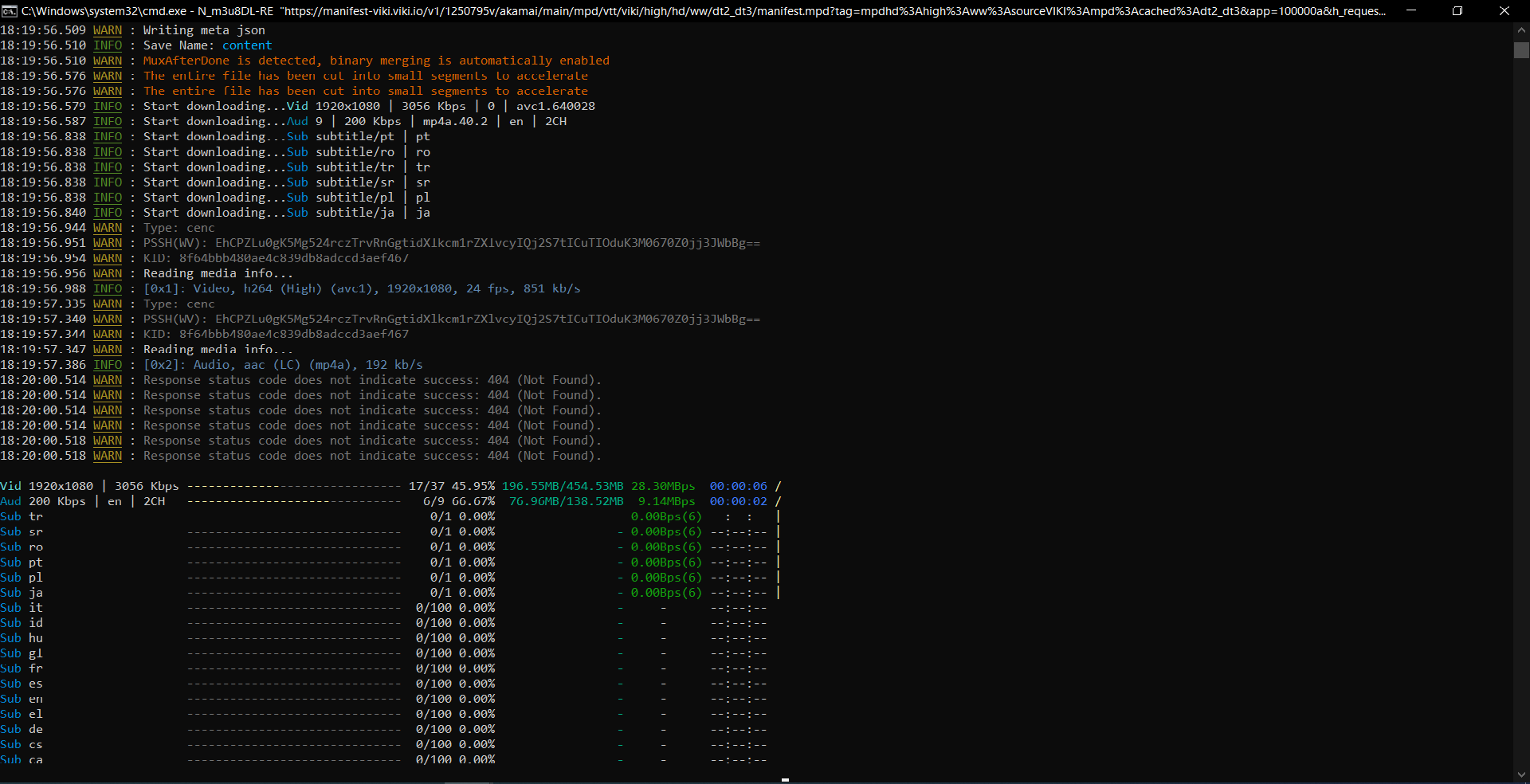 Also removing -mt from parameters might help to stop n_m3u8dl-re from downloading multiple tracks in parallel at once. Viki is kinda picky when it comes to lots of requests--[----->+<]>.++++++++++++.---.--------.