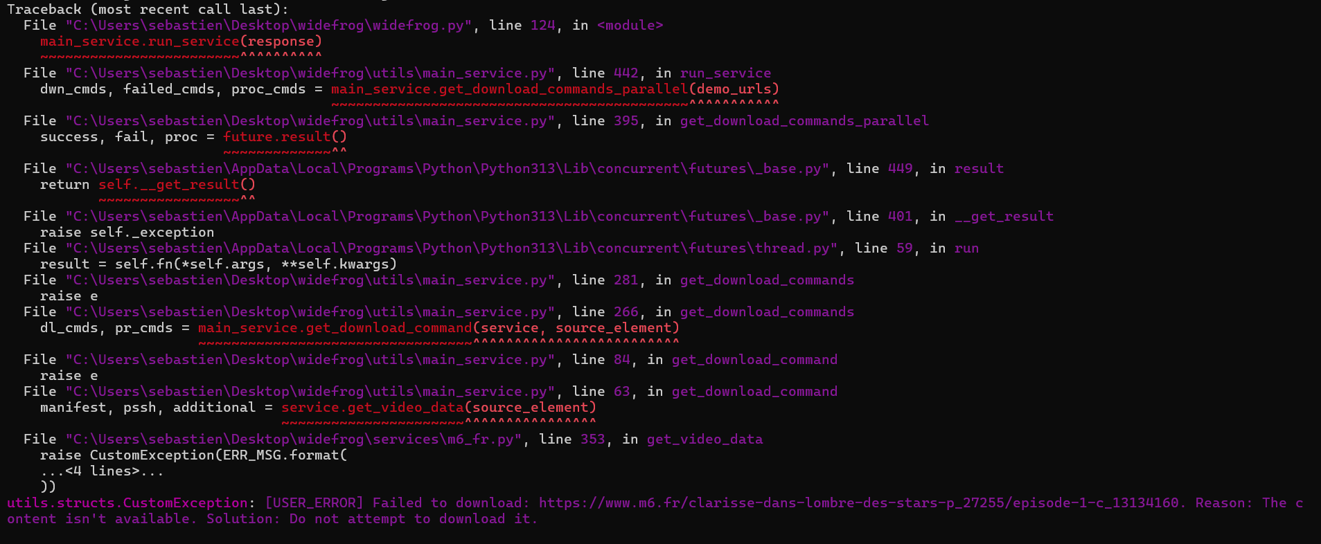Also are you able to play it in the browser?Code:python widefrog.py "https://www.m6.fr/clarisse-dans-lombre-des-stars-p_27255/episode-1-c_13134160" --debug