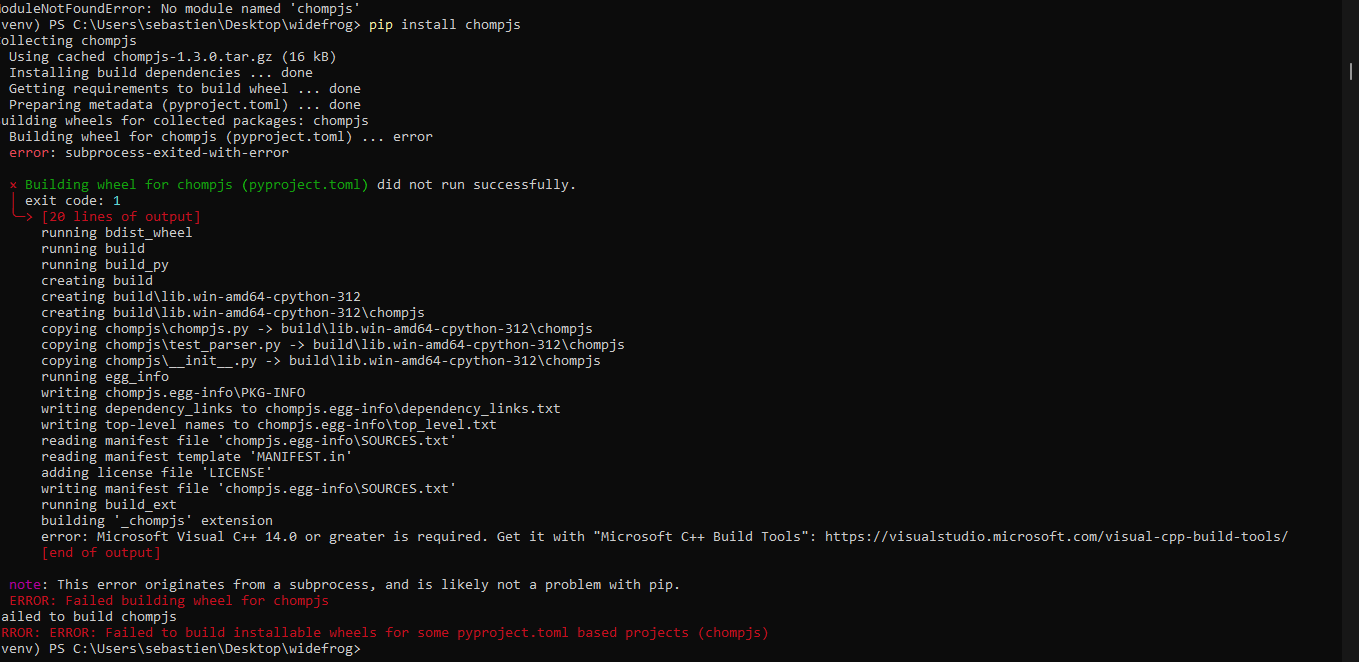 Yep. It tells you exactly whats the issue. chomp_js is not installed. And when you try to install, it tells that you need visual c++ 14.0 and from where to get it. If you want to solve this issue for the future, there are already forum posts at a google search away that explain more in detail. Google is your friend