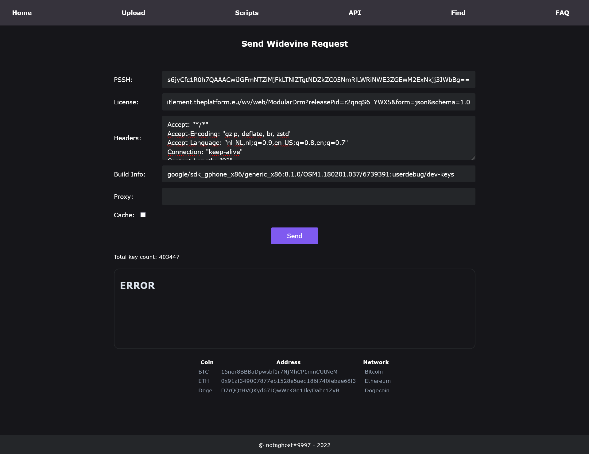 You can't use this website to get keys sadlyCode:{"getRawWidevineLicense":{"releasePid":"r2qnqS6_YWX5","widevineChallenge":challenge}}