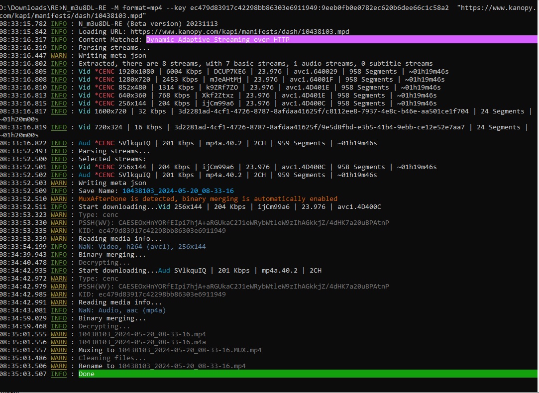 And if it still not work then post video link hereCode:N_m3u8DL-RE "https://www.kanopy.com/kapi/manifests/dash/10438103.mpd" --key ec479d83917c42298bb86303e6911949:9eeb0fb0e0782ec620b6dee66c1c58a2 -M format=mp4
