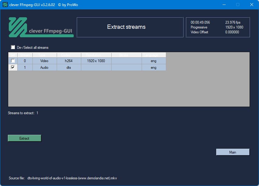 Then load your mkv, click main, click extract streams, uncheck the videostream, click extract.