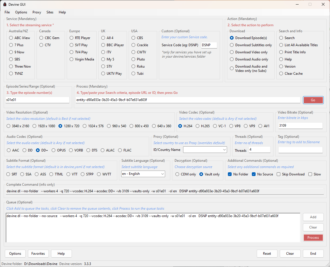 Note: this application does not come with any Services or a CDM - same deal as Devine itself. I have included a bunch of radio buttons for various services - they will only work of course if you have those services configured already.
