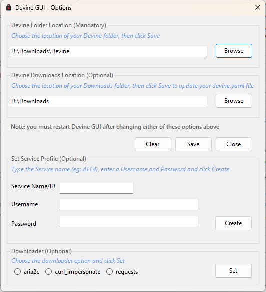 When running DevineGUI for the first tme please set your Devine folder location ie: that is the Devine folder from https://github.com/devine-dl/devine (this is a Mandatory step) You may also choose to set your Downloads folder location in the Options (this is an optional step, however it will update the folderpath in your devine.yaml file if you use this option)