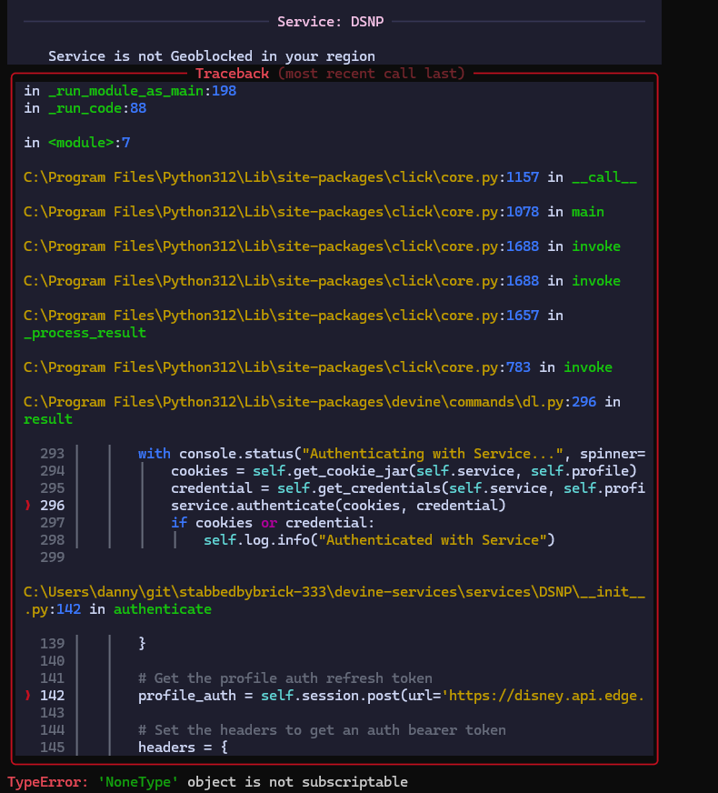2. I use cookies aswell (not sure if you need both but doesn't hurt). Export cookies.txt file, rename as DSNP.txt and place in Devine/cookies folder. See the Devine readme if you need more info on that https://github.com/devine-dl/devine/blob/master/README.md