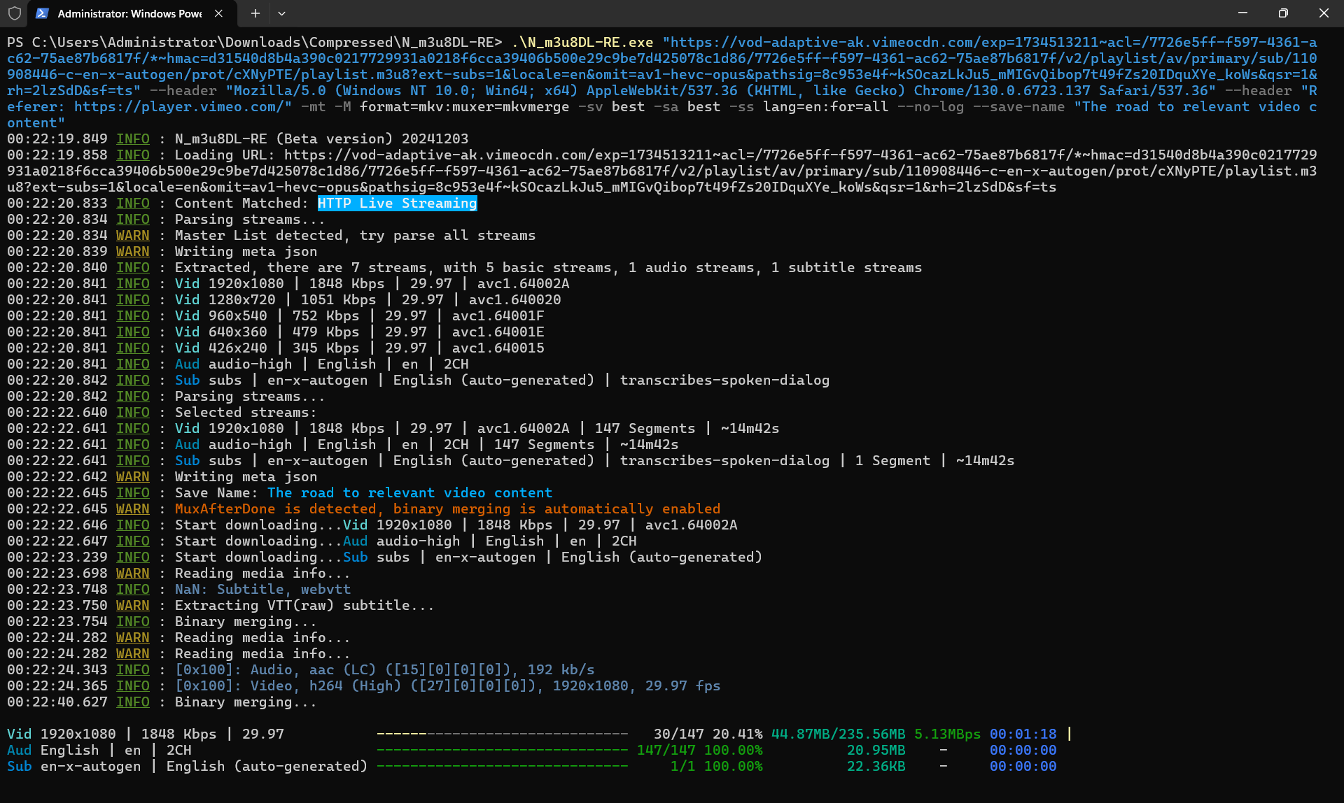 cURL (bash):Code:https://vod-adaptive-ak.vimeocdn.com/exp=1731672793~acl=%2Ff4125790-6d5a-41a5-8cfd-f4b8cb05f483%2F%2A~hmac=4bf29f6361c636e618ac4285d322bec9846c76d24dc1194bb8997461fbd83d5b/f4125790-6d5a-41a5-8cfd-f4b8cb05f483/v2/playlist/av/primary/playlist.json?omit=av1-hevc&pathsig=8c953e4f~J_0BpU-YCvYLVTkv0uk_ATNdlRFnVyDj4HcsAOufl04&qsr=1&rh=eTuzk