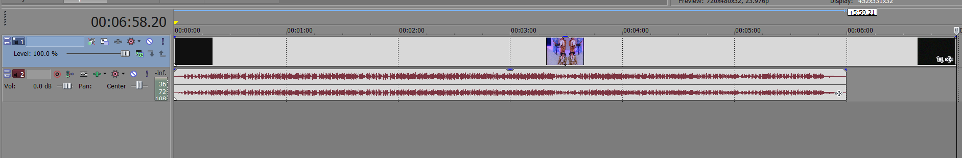 Anyways, I have a youtube download (which is not the problem file before you start raising your eyebrows at using such a god awful source) of a low quality recording of a 1984 Friday Night Videos episode. The only recording I can find of this particular episode. And, due to the music industry wanting to ensure no one has any fun without them getting a cut of money, the recording has been snipped to remove the majority of the music videos, although since my goal is to replace that content with superior sources, that's not a big deal - just adds a bit more of slicing and dicing into my Vegas session to align my sources.