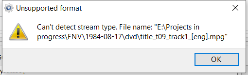 So my mindset is, if I can somehow get a single file that contains both, that should force anything to recognize the sync between them and show them at the right time. So I go back into tsmuxer to combine my mpg (which it extracted in the first place) and .wav into something. I figured tx muxing into a ts file ought to be adequate for our purposes here. However, when trying to do this, tsmuxer throws up this gem: