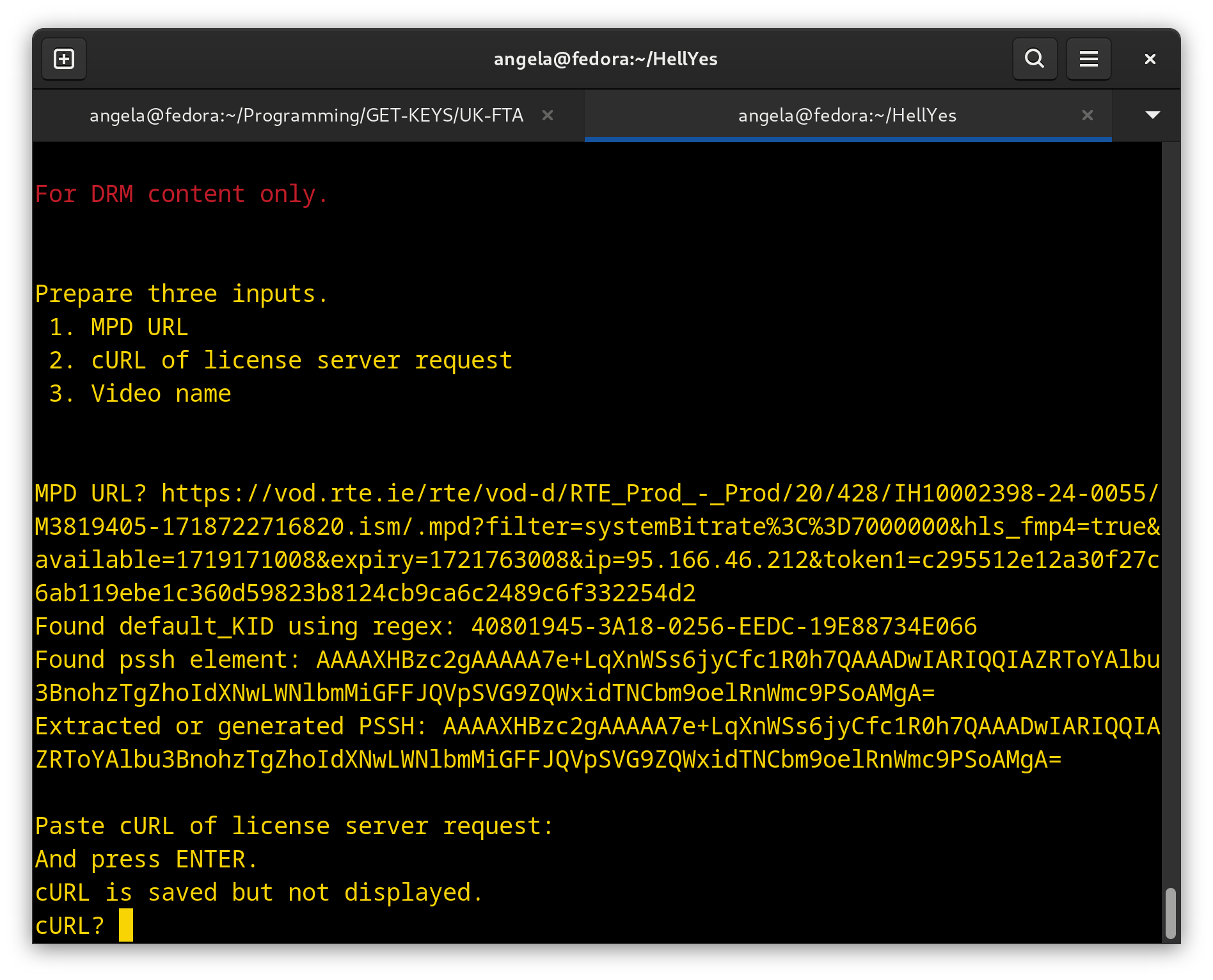 Changing to mp4 returns the below with one mp4 video file in folder but 1kb in size:Code:--key e9f368bda2054d6bb2d1ad28af408473:4b9eaa03cea516f04c1d880081899c02 --key 4c71f008d4214a26822585f997eead1e:6fab79480b7660dc92eb8695205b9269 Save Video as? mux N_m3u8DL-RE 'https://idc104.candl.jp/watch/?a=ka5Wie2uSuIcLojOf9KLpMrAqtJgfDKcsuKOwL2Wncg&h=104&f=fdm0131_00_2m.cmaf&style.mpd' --key e9f368bda2054d6bb2d1ad28af408473:4b9eaa03cea516f04c1d880081899c02 --key 4c71f008d4214a26822585f997eead1e:6fab79480b7660dc92eb8695205b9269 --save-name mux -M:format=mkv ['N_m3u8DL-RE', 'https://idc104.candl.jp/watch/?a=ka5Wie2uSuIcLojOf9KLpMrAqtJgfDKcsuKOwL2Wncg&h=104&f=fdm0131_00_2m.cmaf&style.mpd', '--key', 'e9f368bda2054d6bb2d1ad28af408473:4b9eaa03cea516f04c1d880081899c02', '--key', '4c71f008d4214a26822585f997eead1e:6fab79480b7660dc92eb8695205b9269', '--save-name', 'mux', '-M', 'format=mkv:muxer=mkvmerge'] Press Enter to run the download-command or ctrl+C to exit.Traceback (most recent call last): File "C:\Users\desktop\1\drm\hell3.py", line 396, in <module> input("Press Enter to run the download-command or ctrl+C to exit.") KeyboardInterrupt PS C:\Users\desktop\1\drm> N_m3u8DL-RE 'https://idc104.candl.jp/watch/?a=ka5Wie2uSuIcLojOf9KLpMrAqtJgfDKcsuKOwL2Wncg&h=104&f=fdm0131_00_2m.cmaf&style.mpd' --key e9f368bda2054d6bb2d1ad28af408473:4b9eaa03cea516f04c1d880081899c02 13:09:24.767 INFO : N_m3u8DL-RE (Beta version) 20230628 13:09:24.806 INFO : Loading URL: https://idc104.candl.jp/watch/?a=ka5Wie2uSuIcLojOf9KLpMrAqtJgfDKcsuKOwL2Wncg&h=104&f=fdm0131_00_2m.cmaf&style.mpd 13:09:25.667 INFO : Content Matched: Dynamic Adaptive Streaming over HTTP 13:09:25.669 INFO : Parsing streams... 13:09:25.679 WARN : Writing meta json 13:09:25.686 INFO : Extracted, there are 3 streams, with 2 basic streams, 1 audio streams, 0 subtitle streams 13:09:25.687 INFO : Vid *CENC 5191 Kbps | video_jpn=2001000 | avc1.42C01E | 1 Segment | ~01h18m16s 13:09:25.689 INFO : Vid *CENC 1210 Kbps | video_jpn=501000 | avc1.42C01E | 1 Segment | ~01h18m16s 13:09:25.690 INFO : Aud *CENC audio_jpn=56072 | 73 Kbps | mp4a.40.2 | ja | 2CH | 1 Segment | ~01h18m16s 13:09:33.231 INFO : Parsing streams... 13:09:33.232 INFO : Selected streams: 13:09:33.234 INFO : Vid *CENC 5191 Kbps | video_jpn=2001000 | avc1.42C01E | 1 Segment | ~01h18m16s 13:09:33.235 INFO : Aud *CENC audio_jpn=56072 | 73 Kbps | mp4a.40.2 | ja | 2CH | 1 Segment | ~01h18m16s 13:09:33.237 WARN : Writing meta json 13:09:33.239 INFO : Save Name: _2024-06-30_13-09-25 13:09:34.059 INFO : Start downloading...Vid 5191 Kbps | video_jpn=2001000 | avc1.42C01E 13:09:34.061 WARN : When CENC encryption is detected, binary merging is automatically enabled 13:11:55.806 WARN : Type: cbcs 13:11:55.809 WARN : PSSH(WV): EhDp82i9ogVNa7LRrSivQIRzEhBMcfAI1CFKJoIlhfmX7q0eSPPGiZsG 13:11:55.811 WARN : KID: 4c71f008d4214a26822585f997eead1e 13:11:55.813 WARN : Reading media info... 13:11:55.890 INFO : [0x1]: Video, h264 (Constrained Baseline) (avc1), 640x480, 29.97 fps, 1 kb/s 13:11:55.892 INFO : Binary merging... 13:12:00.769 INFO : Decrypting... 13:12:01.084 INFO : Start downloading...Aud audio_jpn=56072 | 73 Kbps | mp4a.40.2 | ja | 2CH 13:12:12.345 WARN : Type: cbcs 13:12:12.348 WARN : PSSH(WV): EhDp82i9ogVNa7LRrSivQIRzEhBMcfAI1CFKJoIlhfmX7q0eSPPGiZsG 13:12:12.350 WARN : KID: e9f368bda2054d6bb2d1ad28af408473 13:12:12.353 WARN : Reading media info... 13:12:12.452 INFO : [0x1]: Audio, aac (LC) (mp4a), 0 kb/s 13:12:12.454 INFO : Binary merging... 13:12:12.502 INFO : Decrypting... 13:12:14.472 INFO : Done PS C:\Users\desktop\1\drm> --key 4c71f008d4214a26822585f997eead1e:6fab79480b7660dc92eb8695205b9269 --save-name mux -M:format=mkv At line:1 char:3 + --key 4c71f008d4214a26822585f997eead1e:6fab79480b7660dc92eb8695205b92 ... + ~ Missing expression after unary operator '--'. At line:1 char:3 + --key 4c71f008d4214a26822585f997eead1e:6fab79480b7660dc92eb8695205b92 ... + ~~~ Unexpected token 'key' in expression or statement. + CategoryInfo : ParserError: (:) [], ParentContainsErrorRecordException + FullyQualifiedErrorId : MissingExpressionAfterOperator