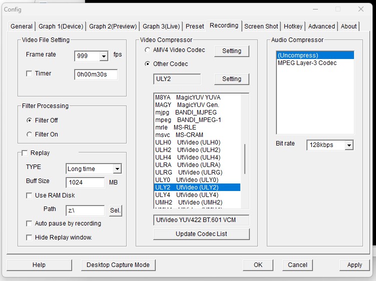 For UTVideo, use the YUV422 BT.601 VCM (ULY2) codec: