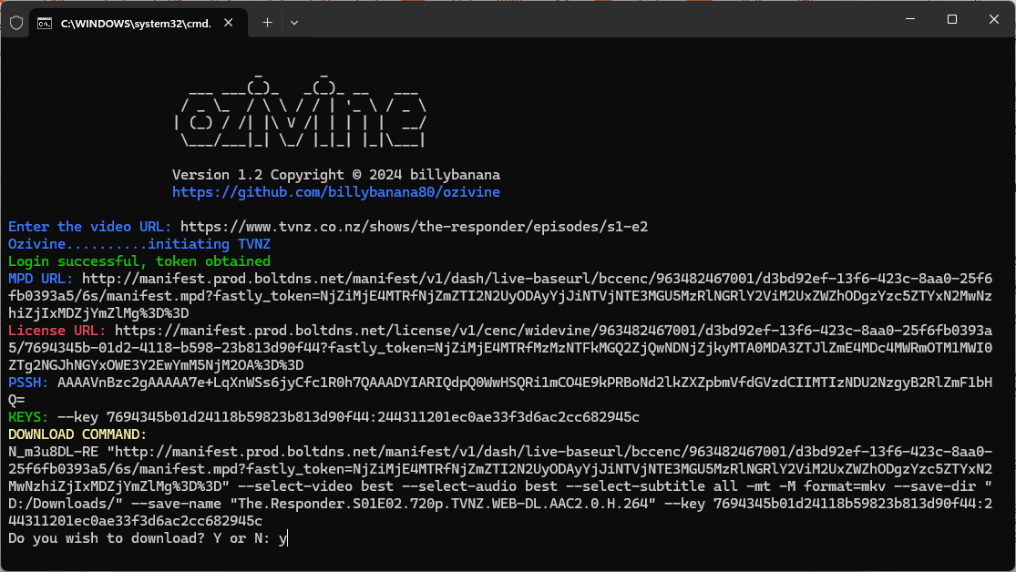 Code:_ _ ___ ___(_)_ _(_)_ __ ___ / _ \_ / \ \ / / | '_ \ / _ \ | (_) / /| |\ V /| | | | | __/ \___/___|_| \_/ |_|_| |_|\___| Version 1.2 Copyright © 2024 billybanana https://github.com/billybanana80/ozivine Enter the video URL: https://www.tvnz.co.nz/shows/my-life-is-murder/episodes/s4-e8 Ozivine..........initiating TVNZ Login successful, token obtained MPD URL: http://manifest.prod.boltdns.net/manifest/v1/dash/live-baseurl/bccenc/963482467001/29ce7b64-52ec-4a8b-9871-12206bd50f00/6s/manifest.mpd?fastly_token=NjZhOWYwYWRfY2Y2ZjQxNTU2NGZlODdmNDBhNDkwMTYyNzlmMzBjYjkzZWMxMDgxZDQ3NTc3YTI3OGI5YzE4OWUxZTExZmVlOA%3D%3D License URL: https://manifest.prod.boltdns.net/license/v1/cenc/widevine/963482467001/29ce7b64-52ec-4a8b-9871-12206bd50f00/25477429-ec25-4536-b504-e1c7ad5b13cb?fastly_token=NjZhOWYwYWRfZTRjYzM5Y2ZmNDBmMmU3Mjg0Y2E0OTA1NGI0ZWYyZGEzNmJjNDIyYjRhZThmMDgwNzcwMWViNzlkMjdhOTZmNg%3D%3D PSSH: AAAAVnBzc2gAAAAA7e+LqXnWSs6jyCfc1R0h7QAAADYIARIQJUd0KewlRTa1BOHHrVsTyxoNd2lkZXZpbmVfdGVzdCIIMTIzNDU2NzgyB2RlZmF1bHQ= KEYS: --key 25477429ec254536b504e1c7ad5b13cb:09731a220fa387fa0f2cb97d2dbc0ae8 DOWNLOAD COMMAND: N_m3u8DL-RE "http://manifest.prod.boltdns.net/manifest/v1/dash/live-baseurl/bccenc/963482467001/29ce7b64-52ec-4a8b-9871-12206bd50f00/6s/manifest.mpd?fastly_token=NjZhOWYwYWRfY2Y2ZjQxNTU2NGZlODdmNDBhNDkwMTYyNzlmMzBjYjkzZWMxMDgxZDQ3NTc3YTI3OGI5YzE4OWUxZTExZmVlOA%3D%3D" --select-video best --select-audio best --select-subtitle all -mt -M format=mkv --save-dir "D:/Downloads/" --save-name "My.Life.Is.Murder.S04E08.720p.TVNZ.WEB-DL.AAC2.0.H.264" --key 25477429ec254536b504e1c7ad5b13cb:09731a220fa387fa0f2cb97d2dbc0ae8 Do you wish to download? Y or N: y 14:27:01.740 INFO : N_m3u8DL-RE (Beta version) 20231113 14:27:01.750 INFO : Loading URL: http://manifest.prod.boltdns.net/manifest/v1/dash/live-baseurl/bccenc/963482467001/29ce7b64-52ec-4a8b-9871-12206bd50f00/6s/manifest.mpd?fastly_token=NjZhOWYwYWRfY2Y2ZjQxNTU2NGZlODdmNDBhNDkwMTYyNzlmMzBjYjkzZWMxMDgxZDQ3NTc3YTI3OGI5YzE4OWUxZTExZmVlOA%3D%3D 14:27:02.023 INFO : Content Matched: Dynamic Adaptive Streaming over HTTP 14:27:02.024 INFO : Parsing streams... 14:27:02.057 WARN : Writing meta json 14:27:02.066 INFO : Extracted, there are 7 streams, with 3 basic streams, 3 audio streams, 1 subtitle streams 14:27:02.067 INFO : Vid *CENC 1280x720 | 1416 Kbps | 75095bc4-cb22-43c2-8ecc-9aa42994a4d6 | 25 | avc1.4d001f | 451 Segments | Main | ~45m06s 14:27:02.067 INFO : Vid *CENC 960x540 | 746 Kbps | d98ab614-5adb-4430-8c43-08adcba26dd0 | 25 | avc1.4d001f | 451 Segments | Main | ~45m06s 14:27:02.068 INFO : Vid *CENC 512x288 | 397 Kbps | cace6341-66ea-4e9b-a3dd-1345266a6378 | 25 | avc1.420015 | 451 Segments | Main | ~45m06s 14:27:02.068 INFO : Aud *CENC 4ad3e1c1-c903-4fd3-8d13-04d479ef666e | 192 Kbps | mp4a.40.2 | en | 454 Segments | Main | ~45m02s 14:27:02.068 INFO : Aud *CENC 0b6cb2e7-d741-4e6c-b373-d41c905e2fb2 | 128 Kbps | mp4a.40.2 | en | 454 Segments | Main | ~45m02s 14:27:02.069 INFO : Aud *CENC 51f3e6ee-cd93-4b4e-baa6-c4090e0dd85d | 64 Kbps | mp4a.40.2 | en | 454 Segments | Main | ~45m02s 14:27:02.069 INFO : Sub 99cd9b91-22f9-402b-a5e0-d066e368aad6 | en-NZ | 1 Segment | ~45m01s 14:27:02.069 INFO : Parsing streams... 14:27:02.072 INFO : Selected streams: 14:27:02.072 INFO : Vid *CENC 1280x720 | 1416 Kbps | 75095bc4-cb22-43c2-8ecc-9aa42994a4d6 | 25 | avc1.4d001f | 451 Segments | Main | ~45m06s 14:27:02.073 INFO : Aud *CENC 4ad3e1c1-c903-4fd3-8d13-04d479ef666e | 192 Kbps | mp4a.40.2 | en | 454 Segments | Main | ~45m02s 14:27:02.073 INFO : Sub 99cd9b91-22f9-402b-a5e0-d066e368aad6 | en-NZ | 1 Segment | ~45m01s 14:27:02.073 WARN : Writing meta json 14:27:02.077 INFO : Save Name: My.Life.Is.Murder.S04E08.720p.TVNZ.WEB-DL.AAC2.0.H.264 14:27:02.078 WARN : MuxAfterDone is detected, binary merging is automatically enabled 14:27:02.079 INFO : Start downloading...Aud 4ad3e1c1-c903-4fd3-8d13-04d479ef666e | 192 Kbps | mp4a.40.2 | en | Main 14:27:02.079 INFO : Start downloading...Vid 1280x720 | 1416 Kbps | 75095bc4-cb22-43c2-8ecc-9aa42994a4d6 | 25 | avc1.4d001f | Main 14:27:02.468 WARN : Type: cenc 14:27:02.468 WARN : PSSH(WV): CAESECVHdCnsJUU2tQThx61bE8saDXdpZGV2aW5lX3Rlc3QiCDEyMzQ1Njc4MgdkZWZhdWx0 14:27:02.469 WARN : KID: 25477429ec254536b504e1c7ad5b13cb 14:27:02.470 WARN : Reading media info... 14:27:02.470 WARN : Type: cenc 14:27:02.471 WARN : PSSH(WV): CAESECVHdCnsJUU2tQThx61bE8saDXdpZGV2aW5lX3Rlc3QiCDEyMzQ1Njc4MgdkZWZhdWx0 14:27:02.472 WARN : KID: 25477429ec254536b504e1c7ad5b13cb 14:27:02.472 WARN : Reading media info... 14:27:02.500 INFO : [0x1]: Video, h264 (avc1), 1280x720 14:27:02.501 INFO : [0x1]: Audio, aac (mp4a), 192 kb/s 14:27:02.539 WARN : The entire file has been cut into small segments to accelerate 14:27:02.540 INFO : Start downloading...Sub 99cd9b91-22f9-402b-a5e0-d066e368aad6 | en-NZ 14:27:02.881 WARN : Reading media info... 14:27:02.911 INFO : NaN: Subtitle, webvtt 14:27:02.915 WARN : Extracting VTT(raw) subtitle... 14:27:02.922 INFO : Binary merging... 14:27:09.703 INFO : Binary merging... 14:27:09.926 INFO : Decrypting... 14:27:36.619 INFO : Binary merging... 14:27:37.063 INFO : Decrypting... 14:27:44.468 WARN : My.Life.Is.Murder.S04E08.720p.TVNZ.WEB-DL.AAC2.0.H.264.mp4 14:27:44.468 WARN : My.Life.Is.Murder.S04E08.720p.TVNZ.WEB-DL.AAC2.0.H.264.en.m4a 14:27:44.468 WARN : My.Life.Is.Murder.S04E08.720p.TVNZ.WEB-DL.AAC2.0.H.264.en-NZ.srt 14:27:44.468 WARN : Muxing to My.Life.Is.Murder.S04E08.720p.TVNZ.WEB-DL.AAC2.0.H.264.MUX.mkv 14:27:45.746 WARN : Cleaning files... 14:27:45.794 WARN : Rename to My.Life.Is.Murder.S04E08.720p.TVNZ.WEB-DL.AAC2.0.H.264.mkv 14:27:45.796 INFO : Done D:\Downloads\Ozivine> -