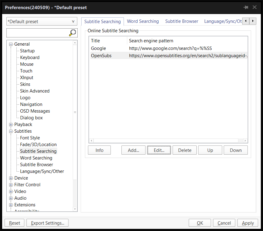 There's another option, Preferences > Subtitles > Subtitle searching. I'm not sure how this one is used.