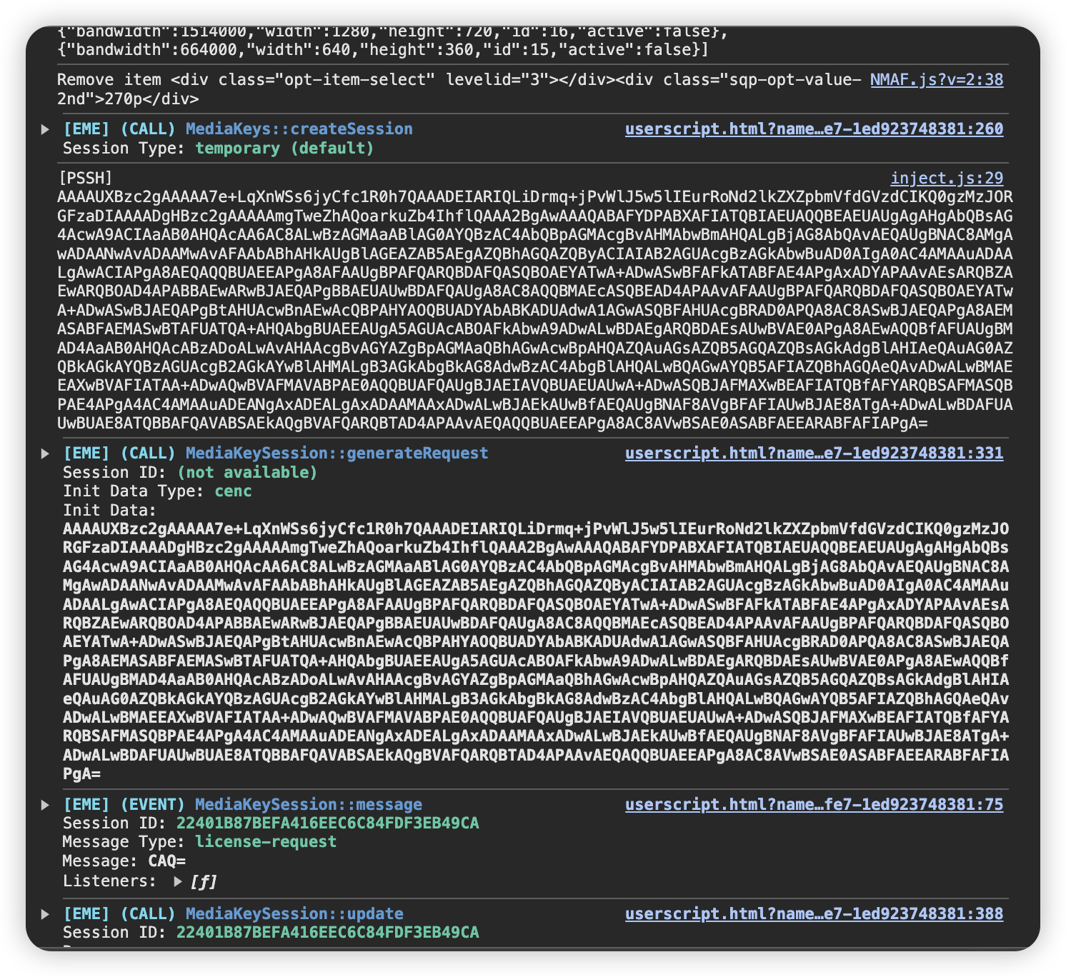 // Refactored conversion functions const fromHexString = hexString => Uint8Array.from(hexString.match(/.{1,2}/g).map(byte => parseInt(byte, 16))); const toHexString = bytes => bytes.reduce((str, byte) => str + byte.toString(16).padStart(2, '0'), ''); const b64ToHex = b64 => [...atob(b64)].map(c=> c.charCodeAt(0).toString(16).padStart(2,0)).join`` // initData to PSSH function getPssh(buffer) { const bytes = fromHexString(toHexString(new Uint8Array(buffer)).match(/000000..70737368.*/)[0]); return window.btoa(String.fromCharCode(...bytes)); } // Get Clearkey keys function getClearkey(response) { let obj=JSON.parse((new TextDecoder("utf-8")).decode(response)) obj = obj["keys"].map(o => [o["kid"], o["k"]]); obj = obj.map(o => o.map(a => a.replace(/-/g, '+').replace(/_/g, '/')+"==")) return obj.map(o => `${b64ToHex(o[0])}:${b64ToHex(o[1])}`).join("\n") } // Widevine PSSH extraction from init const originalGenerateRequest = MediaKeySession.prototype.generateRequest; MediaKeySession.prototype.generateRequest = function(initDataType, initData) { const result = originalGenerateRequest.call(this, initDataType, initData); //Get PSSH and pass into content.js try { console.log("[PSSH] " + getPssh(initData)) document.dispatchEvent(new CustomEvent('pssh', { detail: getPssh(initData) })); } finally { return result; } }; //Clearkey Support const originalUpdate = MediaKeySession.prototype.update; MediaKeySession.prototype.update = function(response) { const result = originalUpdate.call(this, response); try { console.log("[CLEARKEY] " + getClearkey(response)); document.dispatchEvent(new CustomEvent('clearkey', { detail: getClearkey(response) })); } finally { return result; } };