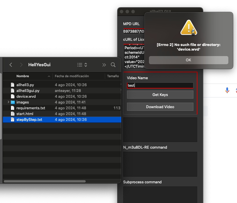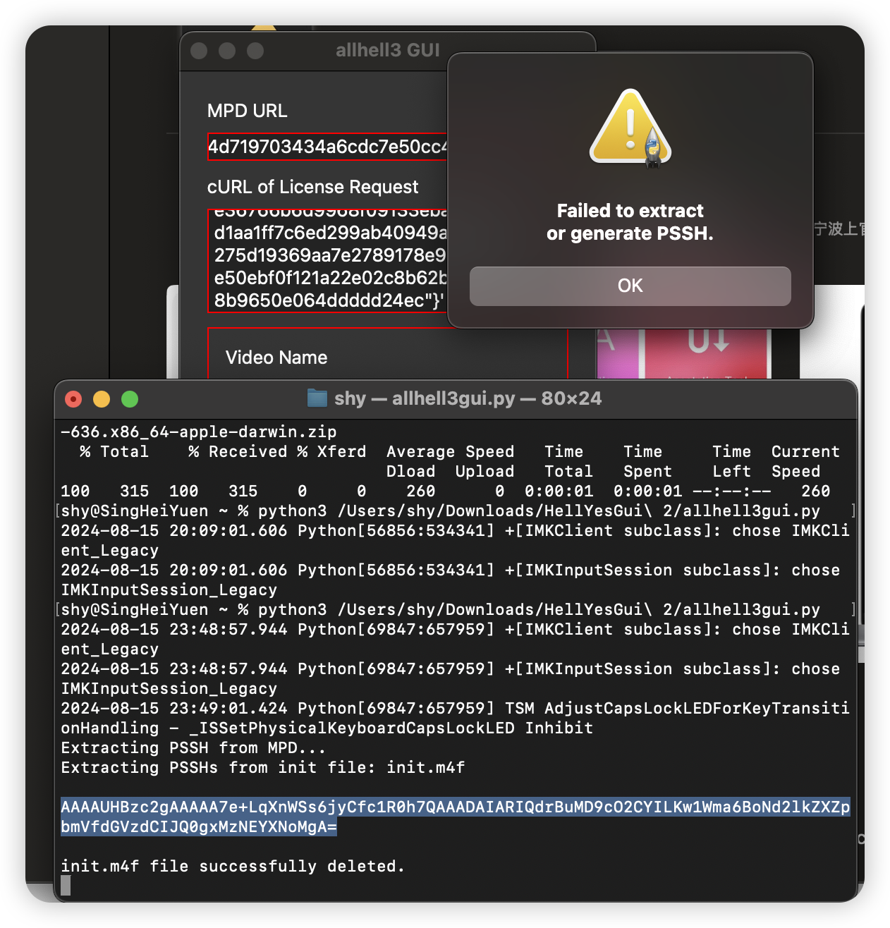 Code:Traceback (most recent call last): File "/Users/shy/Downloads/HellYesGui/allhell3.py", line 424, in <module> key_results = get_key(pssh, lic_url) ^^^^^^^^^^^^^^^^^^^^^^ File "/Users/shy/Downloads/HellYesGui/allhell3.py", line 170, in get_key challenge = cdm.get_license_challenge(session_id, PSSH(pssh)) ^^^^^^^^^^ File "/Library/Frameworks/Python.framework/Versions/3.12/lib/python3.12/site-packages/pywidevine/pssh.py", line 67, in __init__ raise ValueError("Data must not be empty.") ValueError: Data must not be empty. -