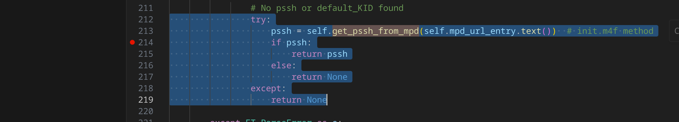 Code:try: pssh = self.get_pssh_from_mpd(self.mpd_url_entry.text()) # init.m4f method if pssh: return pssh else: return None except: return NoneLast edited by A_n_g_e_l_a; 15th Aug 2024 at 15:17.