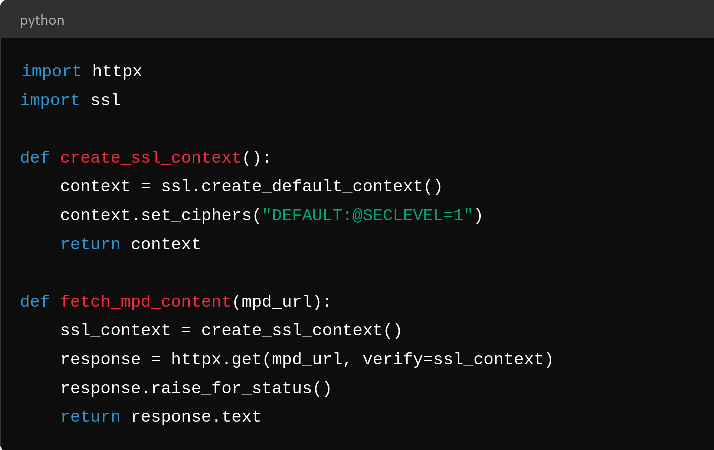 This approach modifies the SSL context to allow smaller DH keys. The SSL context is now customised in your script when making HTTP requests using httpx. The set_ciphers("DEFAULT:@SECLEVEL=1") command hopefully lowers the security level to allow smaller DH keys.Code:import httpx import ssl def create_ssl_context(): context = ssl.create_default_context() context.set_ciphers("DEFAULT:@SECLEVEL=1") return context def fetch_mpd_content(mpd_url): ssl_context = create_ssl_context() response = httpx.get(mpd_url, verify=ssl_context) response.raise_for_status() return response.text