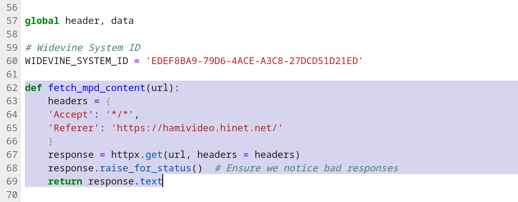 Towards the top of the code (starting line number 162) is a function fetch_mpd_content(url) . Modify it to look like the code below.